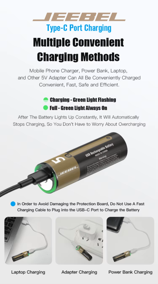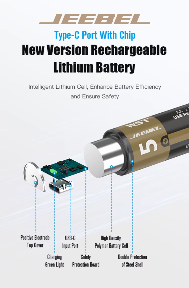 Jeebel JE-B380 AA Rechargeable Lithium Batteries - USB-C, 2800mWh - بطاريات ليثيوم أيون Jeebel JE-B380 AA قابلة للشحن - USB-C، قوة 2800mWh